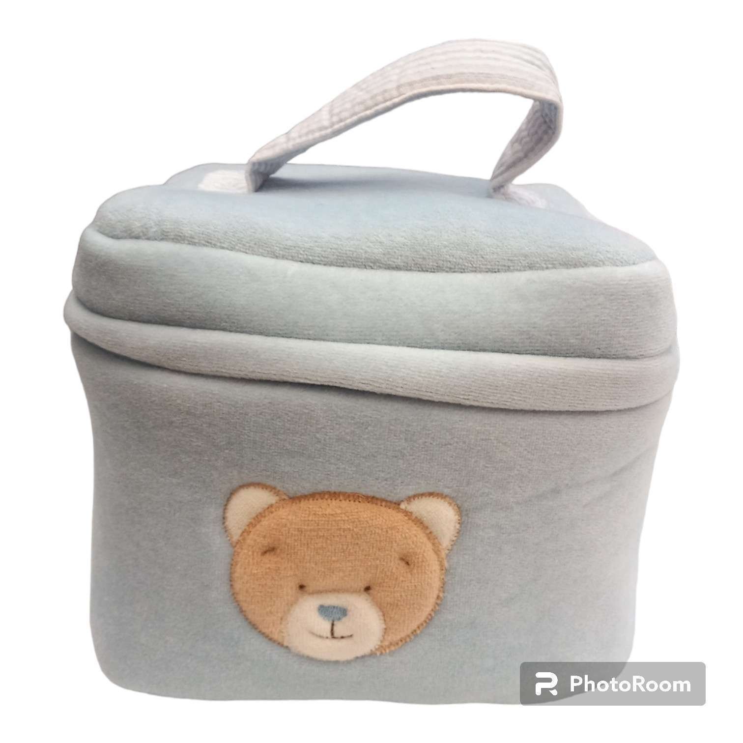 Beauty porta accessori per il bagnetto con applicazione orsetto e fascetta in tela aida per ricamo a punto croce da cucire sul coperchio. Capiente e lavabile. Si chiude con la zip ed ha una comoda maniglia per trasportarlo