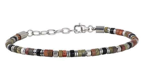 Bracciale da uomo realizzato in acciaio con pietre naturali e anellini in acciaio inox. Combina eleganza moderna e stile ricercato. Lunghezza di 20 cm e chiusura a moschettone regolabile, garantisce una calzata comoda e su misura. Perfetto per chi cerca un accessorio raffinato e versatile, capace di arricchire con personalità ogni look maschile.