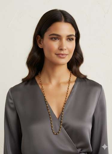 Ogni perlina riflette una calda tonalità ambrata, evocando i raggi dorati del sole e donando un tocco di luminosità a ogni outfit. La sua lunghezza versatile la rende perfetta da indossare singolarmente per un look sofisticato, o da abbinare ad altri bijoux per uno stile più audace e personalizzato.
