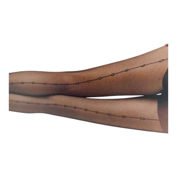 Collant moda velato, riga posteriore alternata a punti luce in lamè argento, soletta con tallone piramidale, corpino senza cuciture