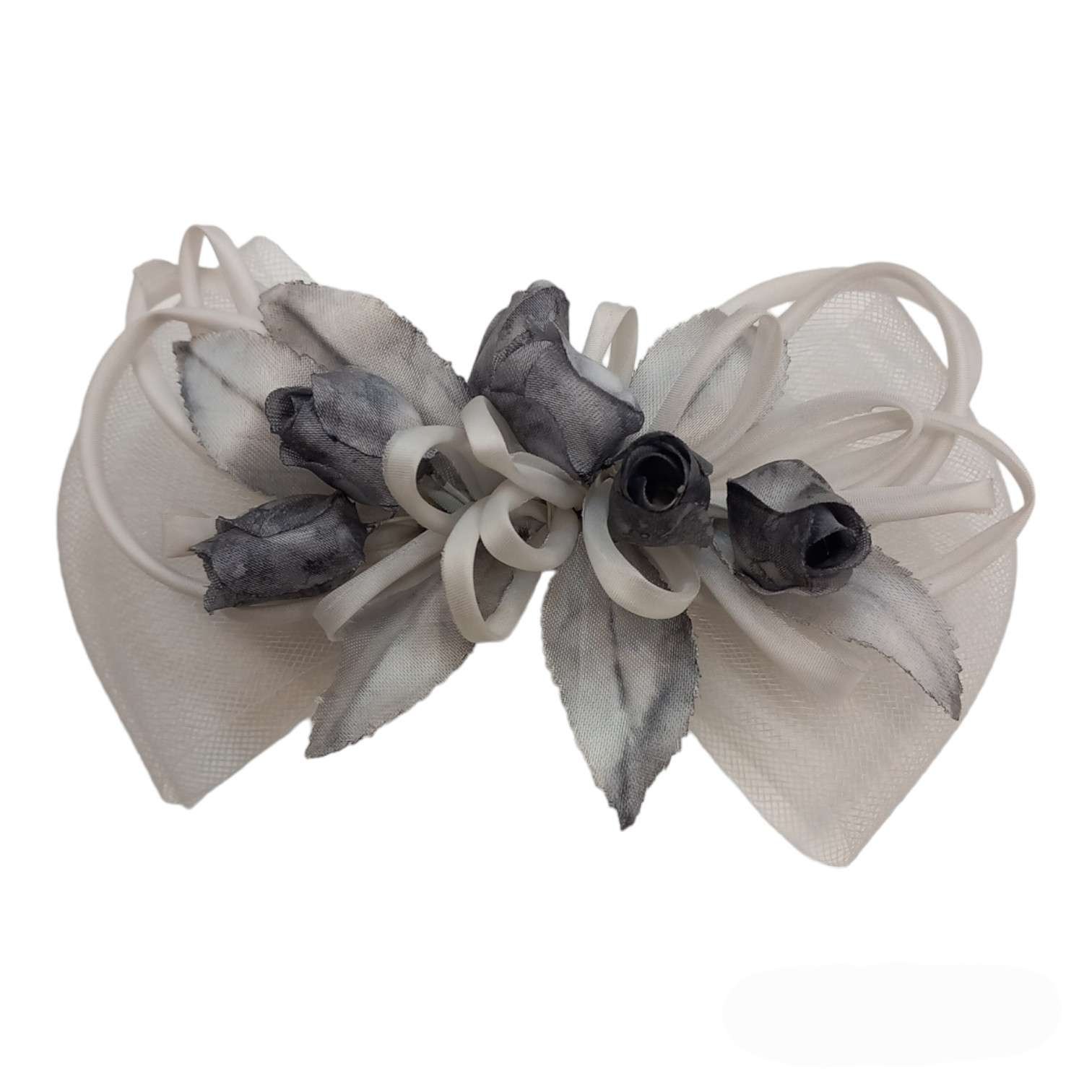 Pettinino per acconciature da sposa o cerimonia. Fiocco in nylon bianco, fiori in materiale sintetico sfumate grigio