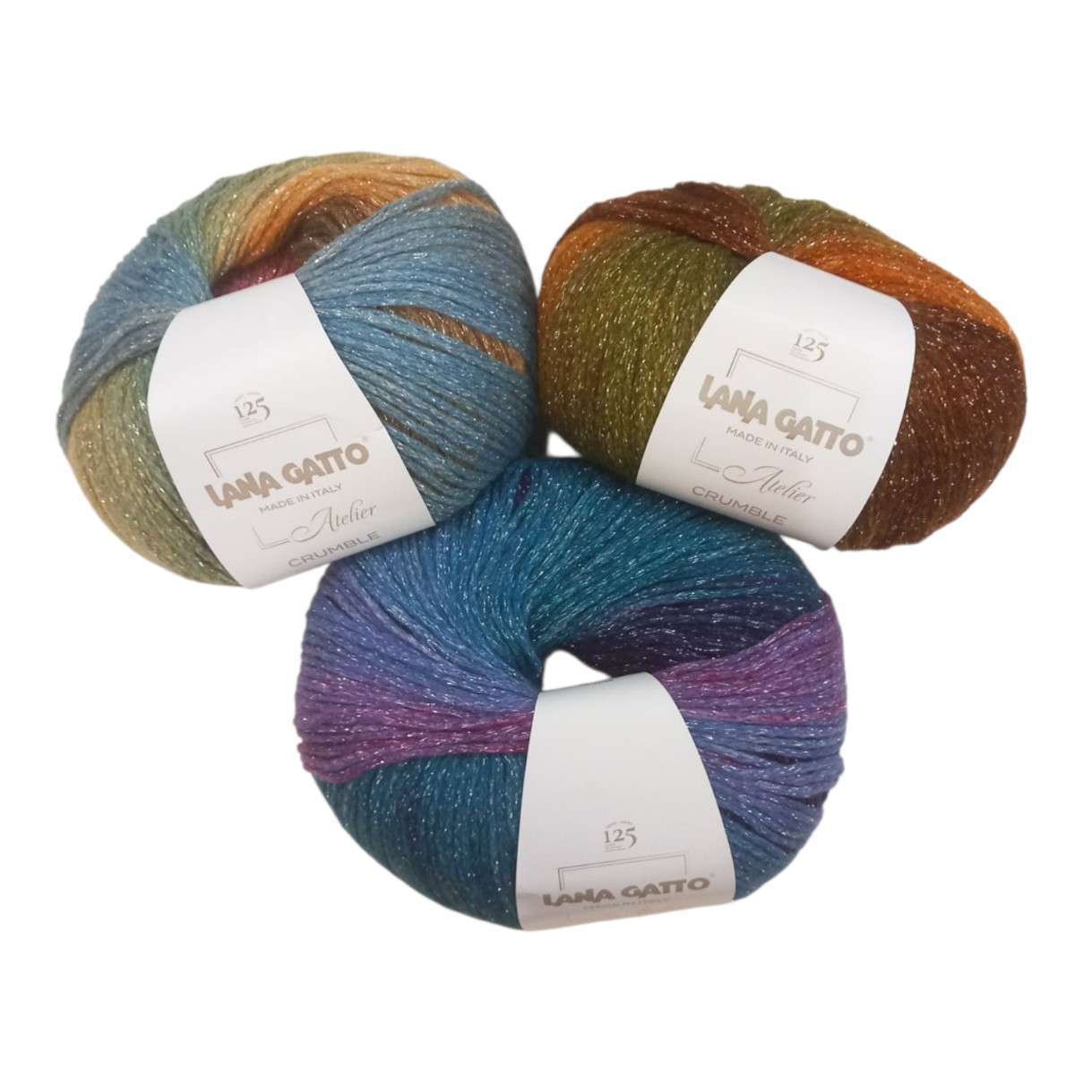 Filato multicolor con struttura a catenelle, la lavorazione ha un effetto a righe molto particolare. Bellissimo per realizzare abiti, maglie, scialli, sciarpe con un tocco di luminosità dato dal filato lurex