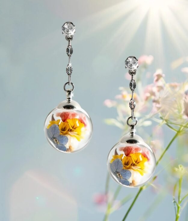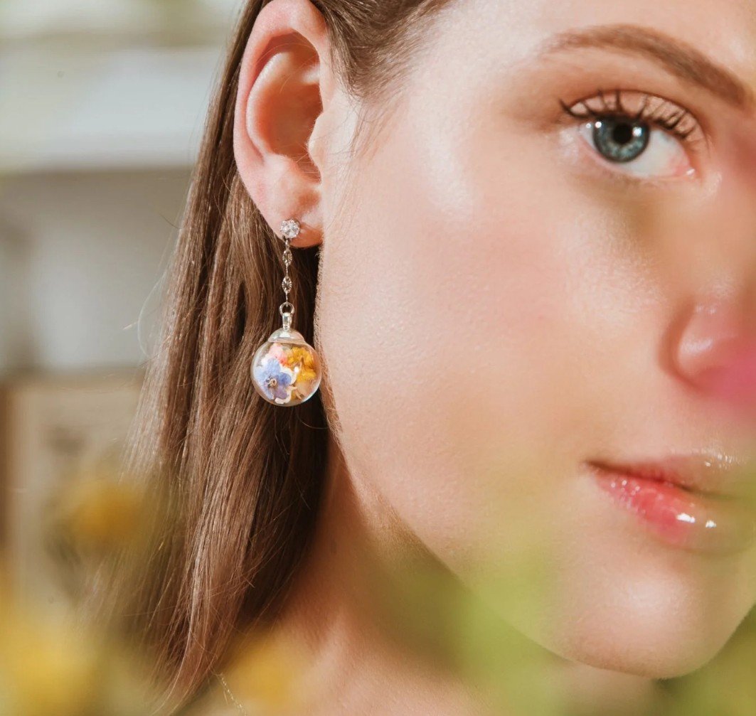 Orecchini con piccole sfere in vetro antiurto contenenti veri fiori di campo essiccati e stabilizzati. Montatura con catena diamantata in acciaio e cristallo a lobo.