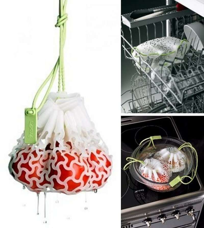La rete per cottura Lékué in silicone, consente di bollire contemporaneamente ma in modo separato, alimenti diversi secondo il loro tempo di cottura.
