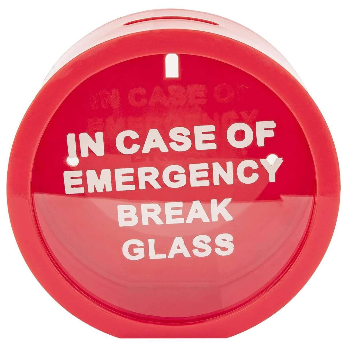 Salvadanaio tondo “In caso di emergenza rompere il vetro”