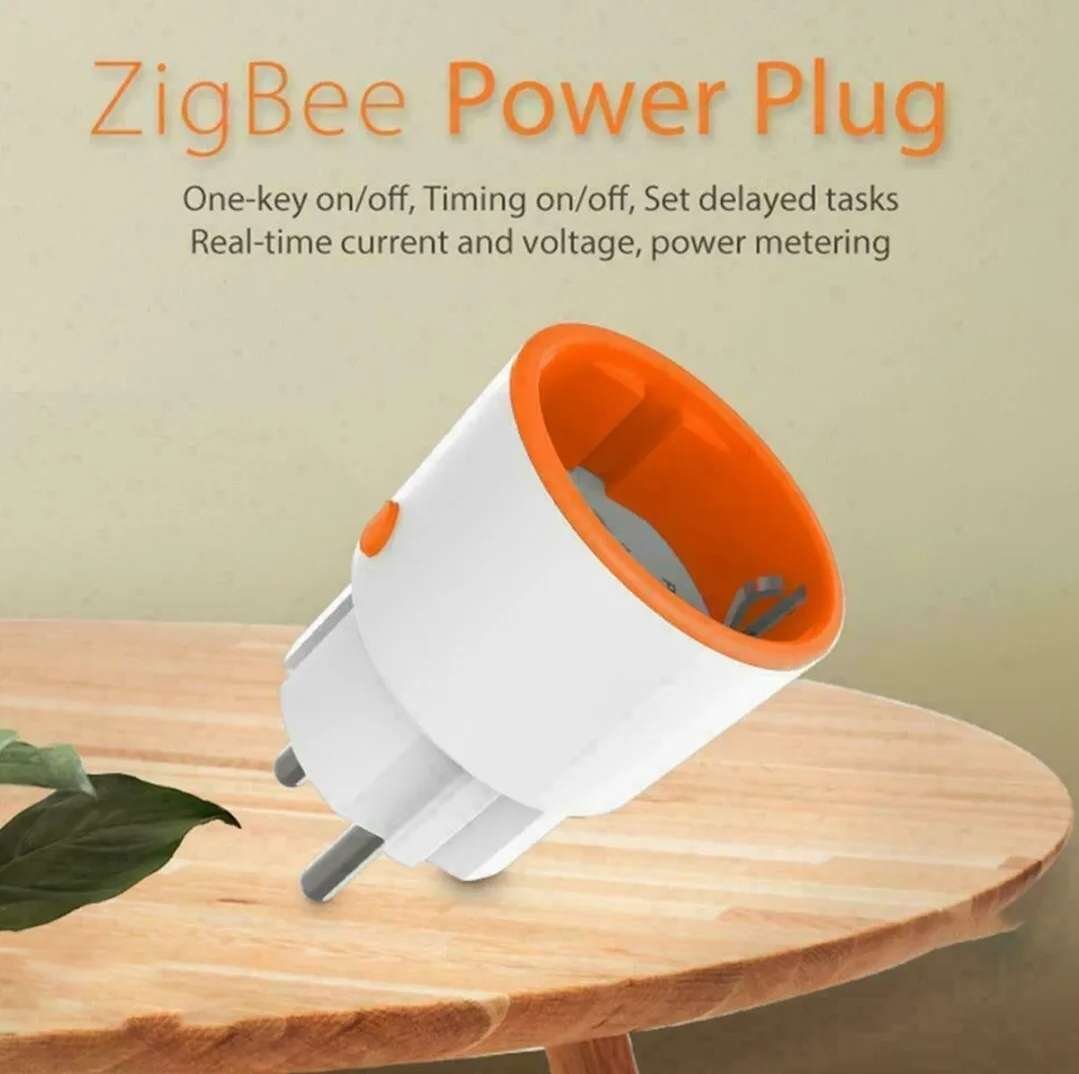 Zigbee Smart Plug con funzione di misurazione e timer, controllo tramite app, notifiche push, hub Zigbee richiesto.